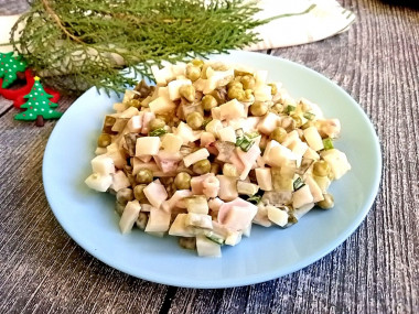 Для разнообразия новогоднего стола сделала салат кальмар огурец солёный. Ингредиентов не много, но получилось очень вкусно. Кальмаров я отваривала не кольцами, а тушками. Варила 1,5 минуты каждую. За это время они успели дойти до готовности, но остались мягкими и нежными. Огурчики у меня свои, солёные, но не кислые. Горошек взяла вкусный, нежный. Обязательно обращаю внимание на состав, если горох брали сушеный, то он будет жёстким и не вкусным. Ну, а лучок вырастили с дочкой на подоконнике). Заправила оливковым майонезом, соль и специи не добавляла. Вполне хватило пряных огурцов и остренького лука. Салат с достаточно ярким вкусом. Мне кажется, подойдет и в качестве закуски и как самостоятельное блюдо.