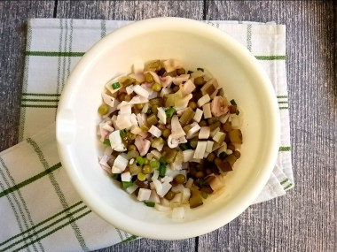 Добавляем майонез и размешиваем салат. Его уже можно не солить.