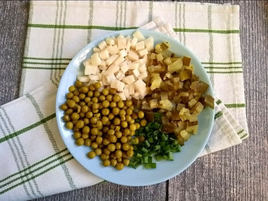 Соленый огурец споласкиваем и нарезаем небольшими кубиками. От него можно отрезать парочку кружков для украшения.