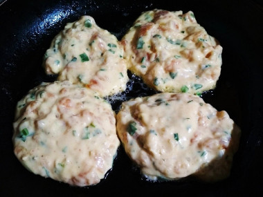 После разделывания рыбы остались хребты. Срезала с них остатки филе сёмги (как раз получились мелкие кусочки). Привлекло интересное название котлеты из красной рыбы. Думаю надо приготовить. Понравилось и то, что можно приготовить массу для жарки котлет заранее и оставить в холодильнике, чтобы готовить позже. Так и поступила. Вечером сделала "тесто", а с утра пожарила котлетки. За ночь всё хорошенько промариновалось и котлеты-оладушки получились очень вкусными! Спасибо за оригинальный и простой рецепт!