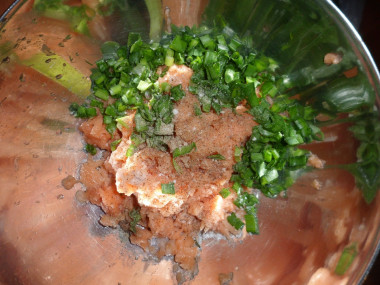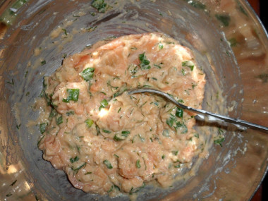 В миске соедините рыбу, зеленый лук, тертый сыр, соль и перец. Влейте сливочно-мучную смесь. Фарш тщательно перемешайте. Количество муки регулируйте в зависимости от плотности массы. Она должна быть не очень плотной, но при этом вязкой и не растекающейся. Дополнительные сведения о муке читайте в статьях под шагами. Поставьте фарш в холодильник на 40 минут. За это время масса еще немного загустеет.