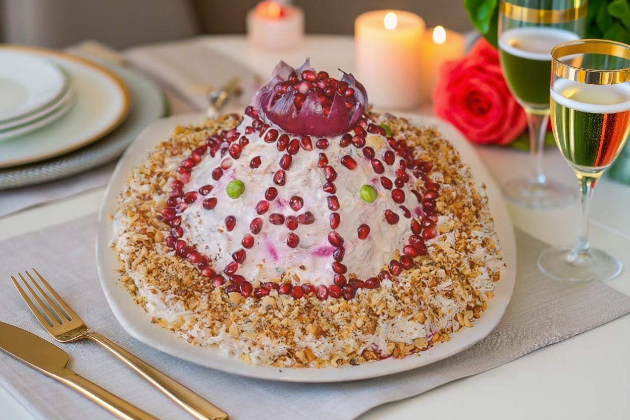 Венец шапки изготавливаем из красного лука, украшенного гранатовыми зернами. Вот и готов наш замечательный салат Шапка Мономаха. Приглашаем гостей и пробуем. Всем приятного аппетита!