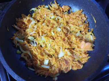 Морковь с куркумой немного обжарить на растительном масле. Затем убавить огонь и тушить до размягчения.