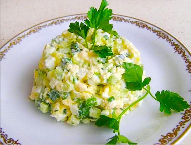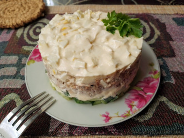 Слои я поменяла местами и нижним слоем уложила огурец, далее рыбу и яйцо. Украсила салат веточкой петрушки.