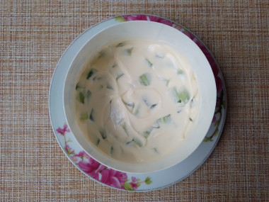 Также в качестве заправки можно использовать не только майонез, но и сметану или натуральный йогурт. Их можно взять по отдельности либо смешать с майонезом в любой пропорции на свой вкус - это снизит калорийность блюда.
