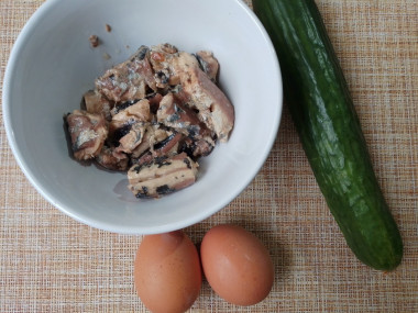 Как сделать салат из консервированной скумбрии с яйцом и огурцом? Подготовьте продукты. Скумбрию выбирайте от проверенного производителя, качественную, лучше, если она будет без добавления масла. Огурцы у меня совсем молоденькие, небольшого размера. Крупный понадобится один. Яйца предварительно отварите. Майонез вы можете сделать дома самостоятельно.