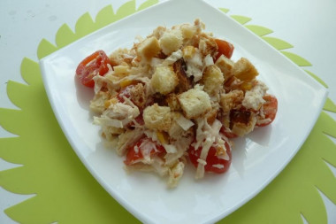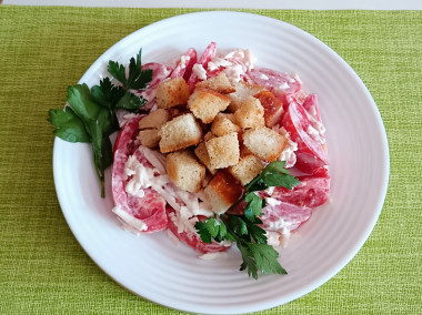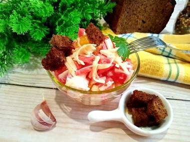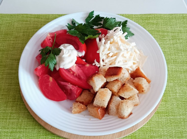 Подсушила кубики белого батона на сковороде и залила их чесночным маслом. Помидоры нарезала дольками и соединила их с натертым на крупной терке сыром. Всё это заправила майонезом с чесноком и сверху выложила сухарики. Мягкий плавленый сырок с майонезом объединили всё ингридиенты салата между собой. Это очень вкусно.
