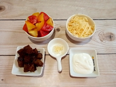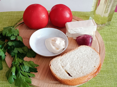 Калорийность продуктов: Помидоры, Твёрдый сыр, Чеснок, Белый хлеб, Растительное масло, Сметана, Соль