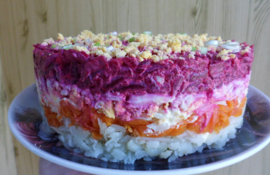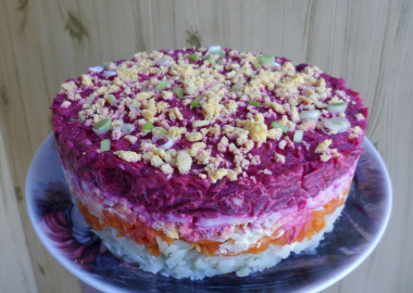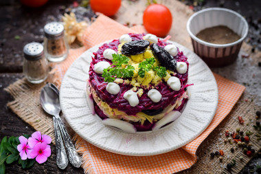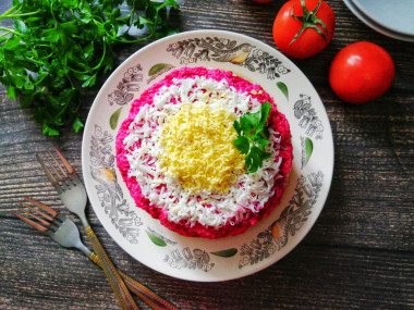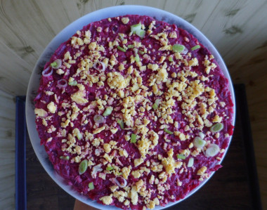 Предварительно отваренную и охлаждённую свёклу очистите от шкурки. Натрите свёклу на крупной тёрке. Добавьте к ней очищенный и пропущенный через пресс чеснок, немного майонеза и перемешайте. Выложите эту смесь заключительным слоем в салате.