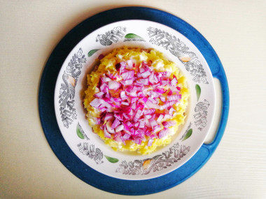 Красный лук очистите от шелухи и мелко порежьте. Выложите следующим слоем в салат.