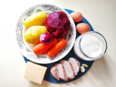 Как сделать Салат Генерал со свеклой и копченой курицей? Подготовьте ингредиенты. Все овощи среднего размера, их предварительно отварите до готовности и охладите. От копчёной курицы я взяла два небольших окорочка, подойдёт и грудка, голени. Лук возьмите красный, он интересней смотрится и не такой острый. Сыр я взяла "Российский". Майонез в этом салата всё-таки рекомендую не заменять, благодаря ему вкус будет насыщенней и салат лучше сохранит форму и слои.