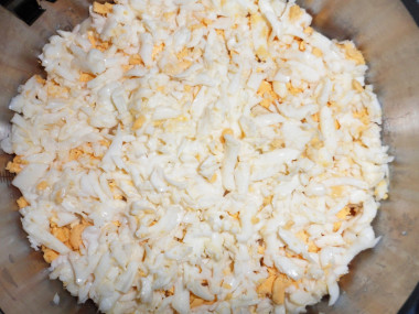 Предварительно отваренные и охлаждённые куриный яйца очистите от скорлупы и натрите на крупной тёрке. Смешайте натёртые яйца с небольшим количеством майонеза и выложите следующим слоем в салате.
