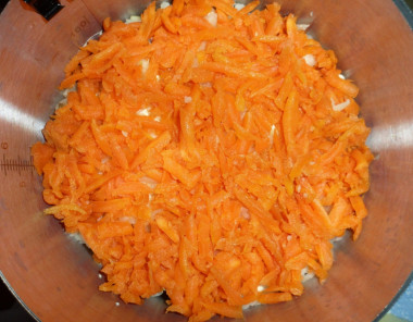 Предварительно отваренную и охлаждённую морковь очистите от шкурки и натрите на крупной тёрке. Выложите натёртую морковь следующим слоем в салат и промажьте майонезом.