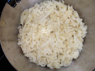 Предварительно отваренный в кожуре и остывший картофель очистите от шкурки и натрите на крупной тёрке. Выложите натёртый картофель вторым слоем в салат (немного присолите по вкусу картофель) и слегка промажьте майонезом или сделайте майонезную сеточку.
