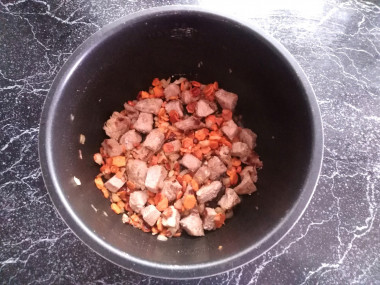 В чашу мультиварки налить растительное масло, положить морковь и установить режим "Жарка" на 15 мин. Дать мультиварке выполнить программу.