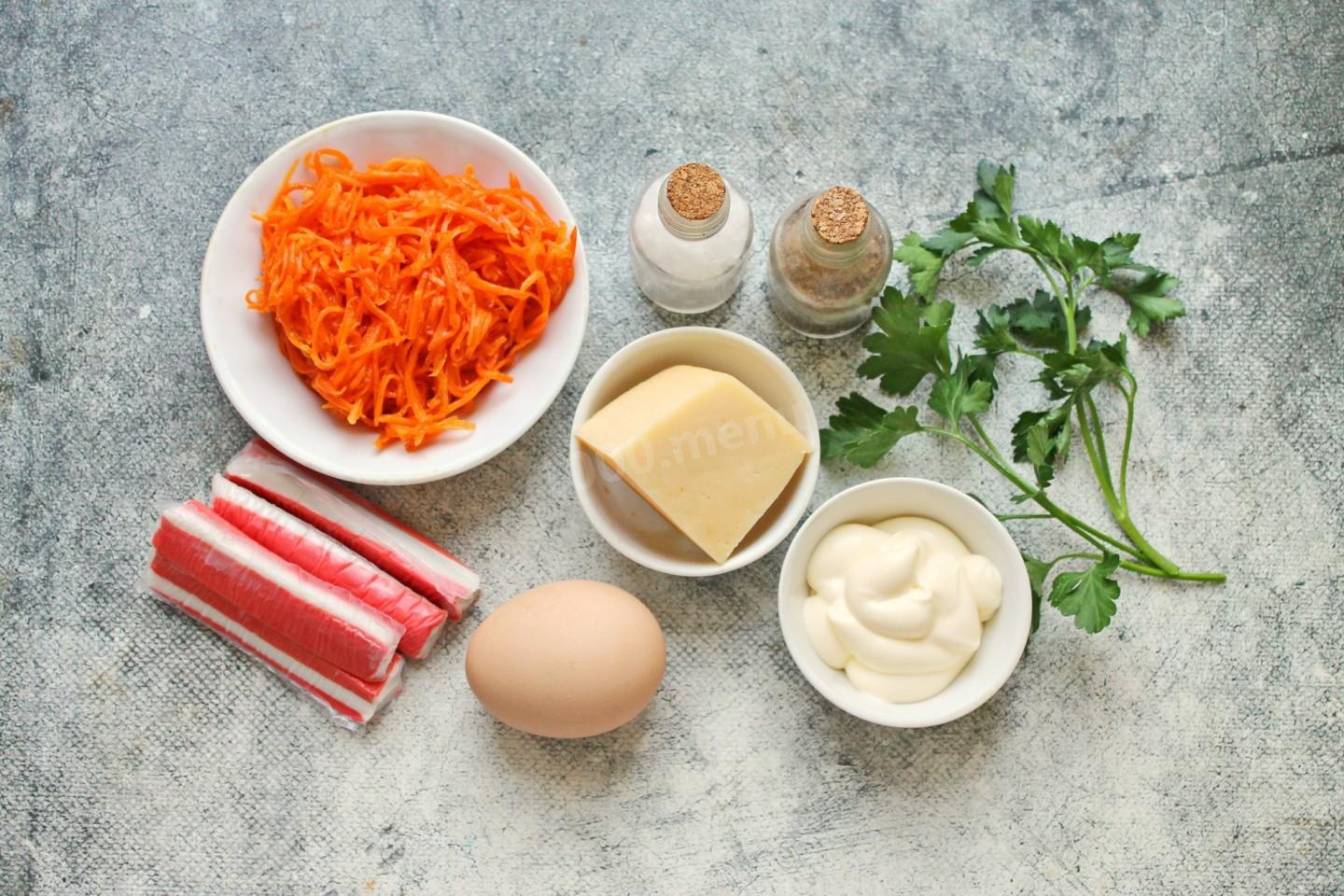 Подготовьте все необходимые ингредиенты для приготовления. Корейскую морковку можно купить в магазине, в овощных лавках или без труда приготовить ее дома. Рецепт корейской моркови можно посмотреть в конце рецепта. Яйца лучше всего отварить заранее и остудить, тогда время приготовления будет не более 15-20 минут. О том, как правильно сварить яйца вкрутую, читайте в конце рецепта.