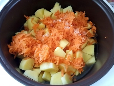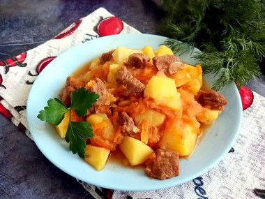 Говядина оказалась жёсткой, поэтому пришлось немного поменять порядок готовки. Сначала я потушила мясо с луком в течение часа. Затем добавила томатный соус, картошку и морковь. Тушила ещё час в мультиварке. Воды добавила побольше, мы любим картофельный соус. Моркови тоже много положила, чтобы получился приятный сладковатый привкус.