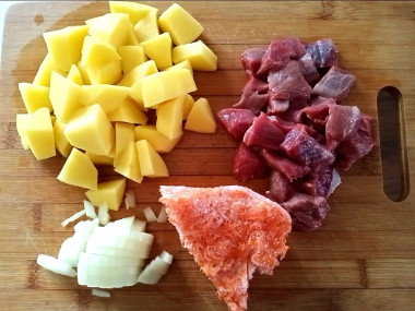 Как сделать тушеную говядину в мультиварке с картошкой? Подготовьте все необходимые ингредиенты. Говядину без кости вымойте под проточной водой, срежьте жир и сухожилия, если они имеются. Это сделает блюдо менее калорийным, а мясо мягким. Порежьте говядину на не крупные кусочки. Так мясо быстрее будет готово. Для этого блюда подойдёт любая говяжья мякоть, предназначенная для жарки или тушения. Поместите нарезанную говядину в чашу мультиварки.