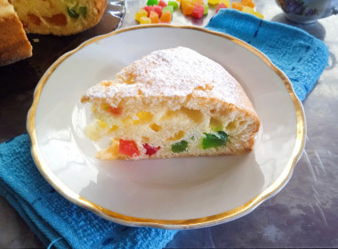 Захотелось испечь пирог с цукатами. Поискав варианты приготовления, мне понравился творожный кекс в мультиварке. Взбила миксером растопленный маргарин с домашними яйцами, сахарным песком, творогом и добавила сухие ингредиенты. Вместо соды положила разрыхлитель. Тесто получилось густое, положила цукаты и перелила в форму. Готовить решила не в мультиварке, хотя она есть, так как перебои со светом. Чтоб не рисковать запихнула форму в газовую духовку. Пекла пирог 55 минут при 180 градусах. Шикарный получился десерт. Когда остыл, порезала на кусочки. В разрезе красота, словно разноцветные самоцветы. Получился кекс нежный, рыхлый, мягкий и очень вкусный. Мне рецепт понравился. Ничего сложного. Быстро и просто. Да, творожные кексы самые вкусные, соглашусь с автором.
