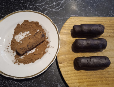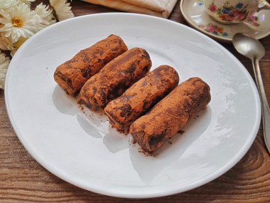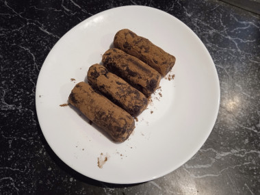 Случайно попала на этот рецепт и меня это обрадовало, так как давно лежит сгущенка. Сделала домашнее пирожное картошка из сухарей со сгущенкой, только не клала грецкие орехи. Вместо них добавила больше измельчённых сухарей. Смешала масло со сгущенкой и какао. Выбрала тёмное какао, чтоб пирожные были аж чёрные. Сахар не клала, как по мне и так было достаточно сладко. Соединила вместе всё, потом слепила палочки, обмакнула в какао и убрала в холодильник. Десерт удался на славу! Мои 10 пирожных улетели в миг!