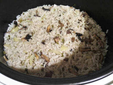 Приготовила кашу с грибами в мультиварке на воде. Действительно, рис по такому рецепту получается не таким рассыпчатым, как в плове, а более вязким. Думаю, что можно также использовать не только его, а любую другую крупу. Для большей сочности добавила порезанный соломкой болгарский перец (но можно было этого и не делать, сочности достаточно от грибов и лука). Сливочное масло заменила растительным. Каша получилась ароматная, сочная, сытная, очень вкусная!