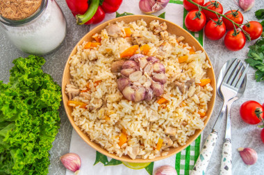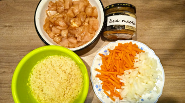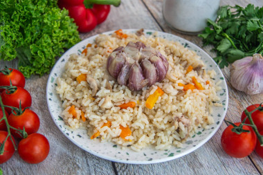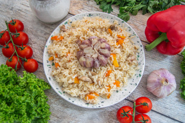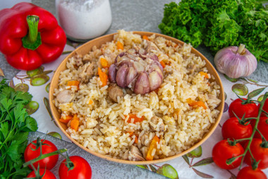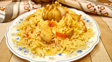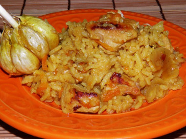 Очень захотелось приготовить плов, но казана, к сожалению, у нас пока нет. Тут на помощь пришла мультиварка, которая долго и без дела стояла в коробке. Моя семья свинину не ест, поэтому использовала филе куриного бедра. Нарезала мясо на небольшие кусочки. Режима "жарка" у меня нет, поэтому готовила на режиме "варка". Влила в чашу мультиварки растительное масло и пару минут обжаривала мясо. Очистила овощи, нарезала и добавила к мясу. Обжарила еще пару минут мясо с овощами. Затем промыла рис в нескольких водах до прозрачности и всыпала в мультиварку. Добавила воды в соотношении 2:1 (2 стакана воды на 1 стакан риса). Посолила, всыпала специи и черный перец. Промыла головку чеснока и воткнула в рис. Закрыла крышку мультиварки и поставила режим "плов". Через 40 минут плов был готов. Убрала чеснок и перемешала рис с мясом.