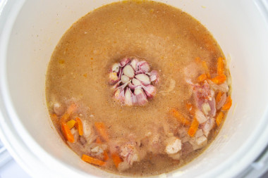Головку чеснока очистите от слоя шелухи, помойте и воткните в рис сверху. Влейте в чашу воду так, чтобы она была выше риса на 1,5 см. Лучше использовать горячую воду, чтобы не тратилось лишнее время на ее нагревание при приготовлении в мультиварке.