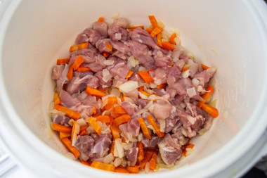 Когда мясо станет серым добавьте лук. Перемешайте. Жарьте мясо с луком около 5 минут. Следом выложите в чашу морковь. Обжарьте все вместе еще в течение 5 минут. Затем посолите и поперчите мясо. Прикройте мультиварку крышкой (без щелчка) и доготовьте мясо до конца программы.