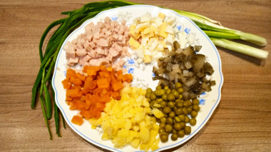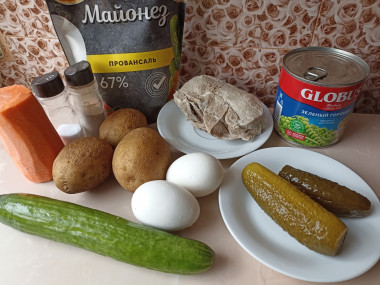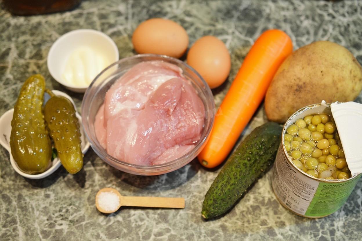 Шаг 1. Как сделать салат Оливье с мясом свинины и солеными огурцами?