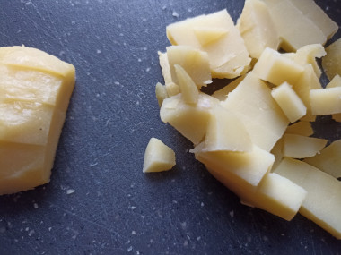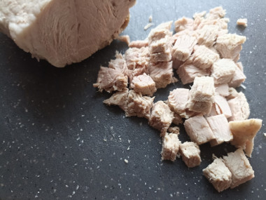 Мясо охладите и нарежьте некрупным кубиком. Картофель нарежьте некрупным кубиком. Вообще считается, что чем мельче нарезан салат, тем вкуснее.
