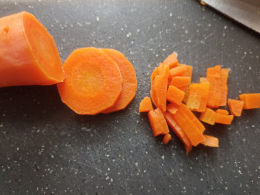 Морковь измельчите аналогичным способом и добавьте к остальным ингредиентам. Яйца также нарежьте мелким кубиком. При нарезке разных продуктов старайтесь, чтобы величина кубиков была одной - так салат будет гораздо красивее.