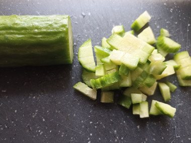 Свежий огурец хорошо помойте, срежьте кончики и нарежьте также кубиком той же величины, что и картофель. Если вы собираетесь хранить салат несколько дней, то предварительно удалите семена огурца ложкой. Семена дадут лишнюю жидкость и салат будет водянистым. Соленые огурцы также помойте, чтобы смыть с них лишнюю соль, особенно если это покупные огурцы, а не вашего приготовления. Нарежьте соленые огурцы также кубиком.