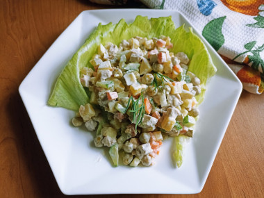 Все нарезанные ингредиенты переложите в салатник. С горошка слейте лишнюю жидкость и добавьте к остальным ингредиентам. Заправьте салат майонезом и перемешайте. При необходимости посолите салат. Майонез можно сделать самостоятельно. Рецепты приготовления домашнего майонеза собраны в каталоге по ссылке в конце рецепта. Приятного аппетита!