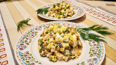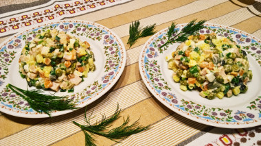 Также в качестве заправки можно использовать не только майонез, но и сметану или натуральный йогурт. Их можно взять по отдельности либо смешать с майонезом в любой пропорции на свой вкус - это снизит калорийность блюда.