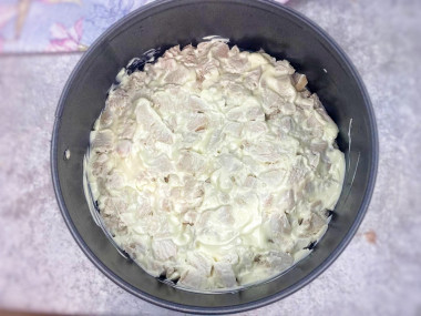 Далее я распределила оставшееся куриное филе и также полила его майонезом.