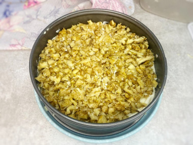 Последний слой - измельченные грецкие орехи. Салат слегка прижмите руками или специальной круглой насадкой для трамбовки. Поставьте салат в холодильник на 1-2 часа для пропитки. Если оставляете дольше, затяните форму пищевой пленкой.