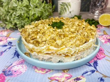 Салат с курицей грецкими орехами и сыром — для меня новое открытие среди салатов. Мне нравится сочетание курицы с ананасом, а вот с яблоком готовила впервые. Оказалось, это тоже очень интересное сочетание. Сыр прекрасно дополняет вкус, его я натерла на мелкой терке, получился более воздушный слой. Ну и, конечно же, грецкий орех играет свою роль в вкусовом сочетании и в декоративном виде салата. У меня получился небольшой объем салата, курица вышла всего в один слой, но, думаю, это не сильно повлияло на вкус. Яблоки майонезом не смазывала, мне показалось, что достаточно его в других слоях, да и своя сочность у них есть. Еще привлекло в салате то, что он слоеный, а я такие обожаю — они кажутся более праздничными. В общем, попробуйте, салат несложный, достаточно легкий, вкусный, в то же время сытный.