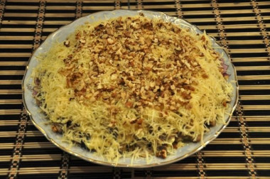 Ого! отличный салат на праздничный стол. У меня получилось не плохо. Всем понравилось. Но я больше люблю похожий салат но с черносливом. Один из самых вкусных салатов. Приготовь обязательно!