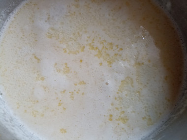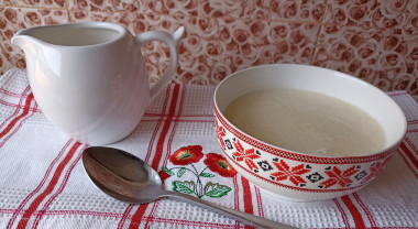 Я готовила на три порции. Порции получаются достаточно большие. Вместо четырёх столовых ложек сахара положила только две, получилось вполне сладко. Молока налила половину от предложенного количества (300 мл). Вышло что-то среднее между супом и кашей.