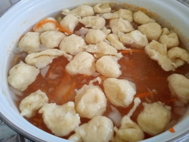 Для этого тесто зачёрпывайте чайной ложкой и опускайте в суп, помогая второй ложкой. Суп доведите до кипения, поварите ещё 5 минут и снимите кастрюлю с огня.