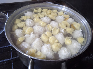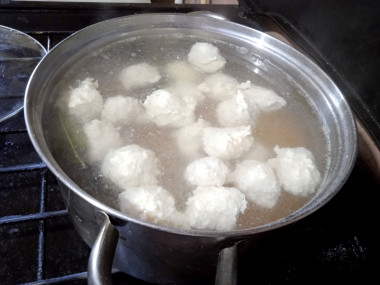 После того как суп закипит, опустите в него картофель и фрикадельки. Варите суп до готовности картофеля примерно 7-10 минут. Пока варится суп, приготовьте клёцки.