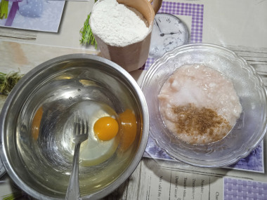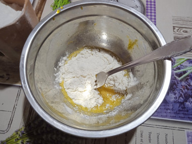 Для этого муку и оставшееся взбитое яйцо смешайте. Тесто по консистенции должно получиться, как густая сметана. Если тесто будет слишком густым, добавьте немного воды.