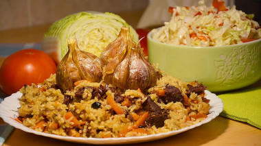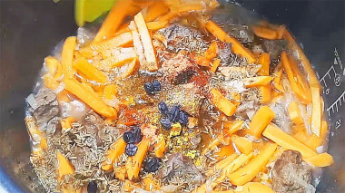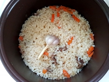 Следуя шагам, сначала обжарила кусочки мяса. Затем добавила лук кубиками и сладкую морковь, нарезанную брусочками. Все это слегка подрумянилось, при этом уже поплыл такой аппетитный аромат! Пока готовился зирвак, я промыла и замочила круглозерный рис, чтобы вышел лишний крахмал. Мне нравится именно круглый рис в плове или кубанский "для плова". Воды взяла в два раза больше по объему, чем риса. После окончания программы "плов" вся вода впиталась в рис. Сок от мяса и овощей распределился по всему плову, это очень вкусно! Говядина стала мягкой и нежной. Из специй я использовала только зиру. Эти мелкие зернышки слегка согревают своей остротой и хорошо сочетаются с мясом на мой взгляд. А еще меня всегда удивляет как головка чеснока отдает свой шикарный аромат и привкус плову и при этом остается целой). В общем всем советую этот рецепт, плов отличный получается!