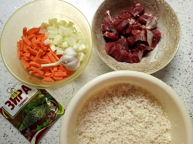 Как сделать плов с говядиной в мультиварке? Очень легко и просто. Для начала подготовьте необходимые ингредиенты по списку. Говядина нужна без кости, только мякоть. Это может быть лопатка, окорок, голяшка или тазобедренная часть. Указанные специи можете заменять и дополнять по вкусу.