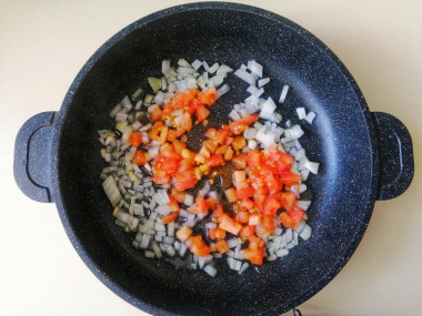 Нарезанный лук обжарьте на сковороде с добавлением оливкового масла в течение 2-3 минут, до легкого золотистого цвета. Затем в сковороду к луку добавьте половину нарезанных помидоров. Периодически помешивая, тушите овощи в течение 5-7 минут.