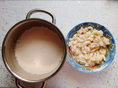 В кастрюле или сотейнике вскипятите 1 л воды со щепоткой соли. Выложите макароны и варите на среднем огне 2-3 минуты. При этом необходимо часто помешивать макароны, чтобы они не прилипли ко дну и не слиплись между собой. Если хотите сварить молочный суп с вермишелью, то этот шаг нужно пропустить и сразу закинуть ее в горячее молоко. Ведь время варки вермишели зачастую меньше, чем у остальных макаронных изделий.