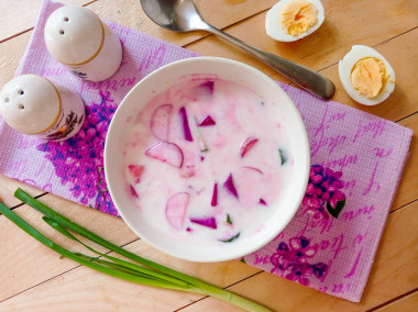 Отличное первое блюдо для лета. В жаркую погоду, когда не хочется горячего борща или супа, в нашей семье часто готовится окрошка. А этот холодный борщ – прекрасная идея для разнообразия. Картошку можно сварить не в мундире, а почистить, порезать кубиками и варить до готовности. Воду слить, остудить и ею залить все ингредиенты. Тогда борщ будет более насыщенным и питательным. И еще я обязательно добавляю мелко нарезанную зелень – петрушку, укроп и зеленый лук; получается очень вкусно!