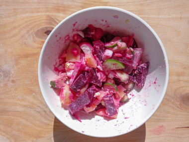 Выложите все нарезанные овощи в миску. Добавьте туда же маринованную свеклу. Кроме вышеперечисленных продуктов вы можете использовать вареную колбасу или мясо, тогда получится более сытное блюдо.