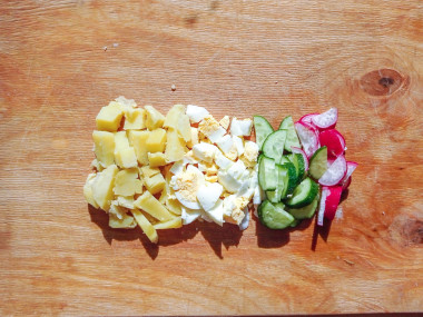То же самое проделайте и с редиской — нарежьте или натрите.