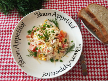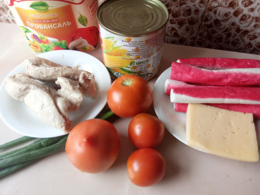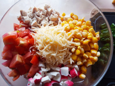 Укладываем в салатник курицу, крабовые палочки, томаты, лук и кукурузу.